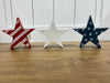 Handmade and painted wooden stars in a distressed red, white, and blue for the Fourth of July holiday. Set of 3 stars. 5”x5”