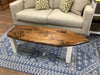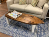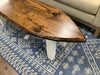 Wood surf board bench/table with white legs and stained top. 51”x18”x17”