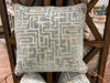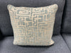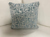 Blendown throw pillow with geometric pattern upholstery fabric, blue/light gray. Welted with zipper. 17” x 17”.