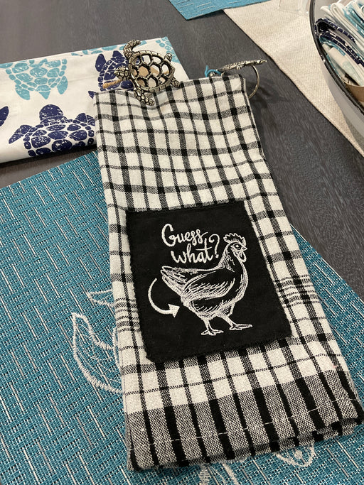 Out of stockLinen towel with an embroidered patch with chicken and saying in various colors. 16”x26"