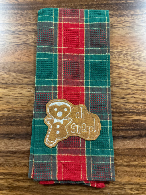 Out of stock100% cotton dish towel with felt gingerbread man shouting “Oh snap!”. 20 x 23”