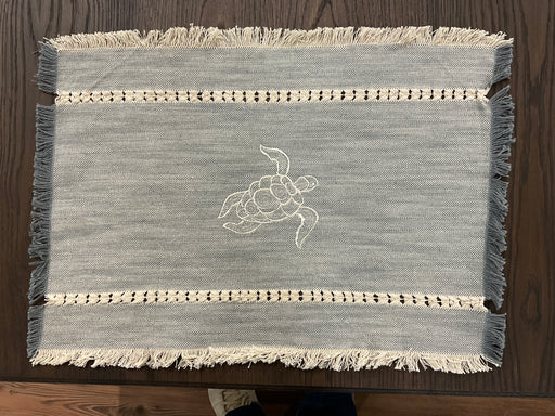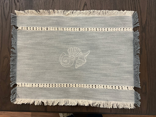 Out of stockLight blue and cream woven with fringed edge placements embroidered with beachy image. 22"x16"