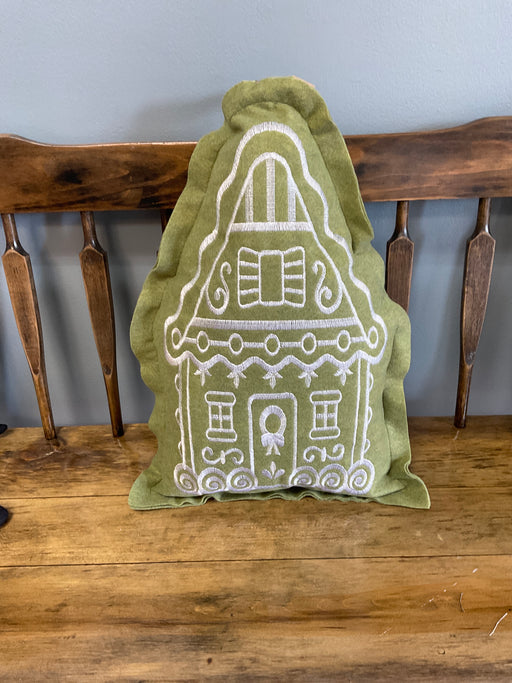 Out of stockColored felt embroidered gingerbread house pillow, 20” x 15”, hand crafted