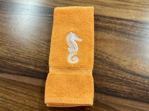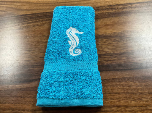 Out of stockHand towel embroidered with a seahorse. Various colored towels. 26 1/2” x 15 1/2”