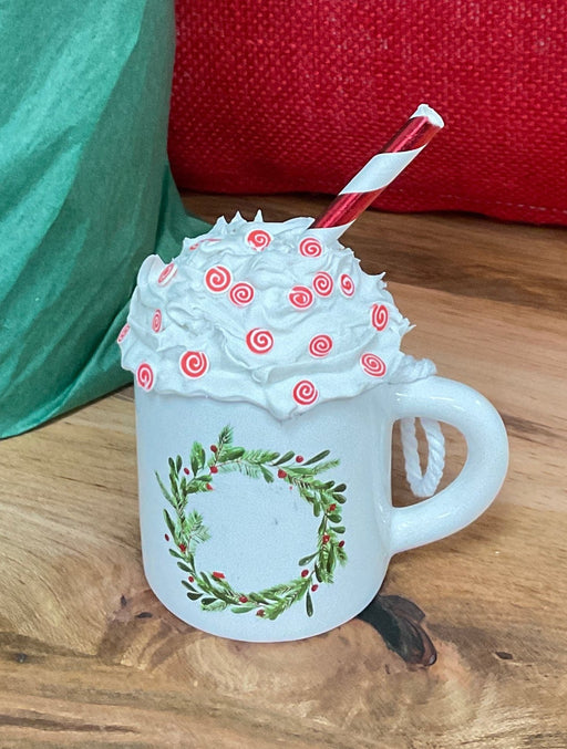 Only 1 left!Small white cup with wreath decorated with faux whip cream, straw and a variety of sprinkles. Includes hanging wire. 3” x 4.5”