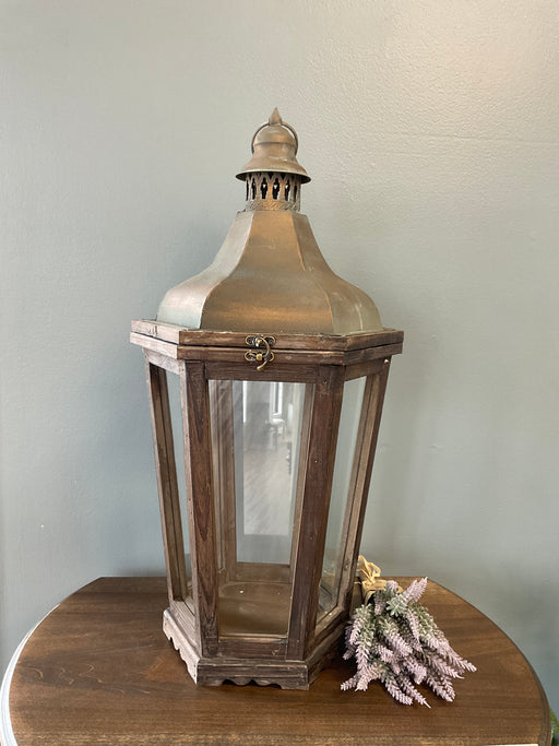 Only 2 left!Wood lantern with glass sides and metal top. 3 sizes.