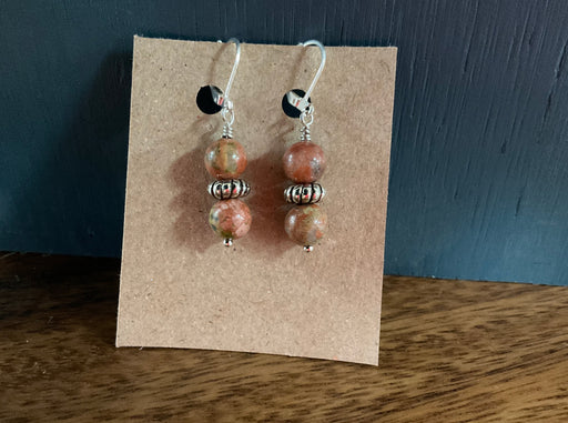 Only 1 left!Brown stone beads separated by a silver bead earrings with silver lever backs.1.5”