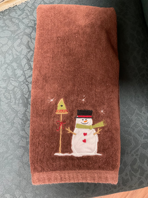 Only 2 left!Brown hand towel embroidered/fabric snowman design. 15 x 23”