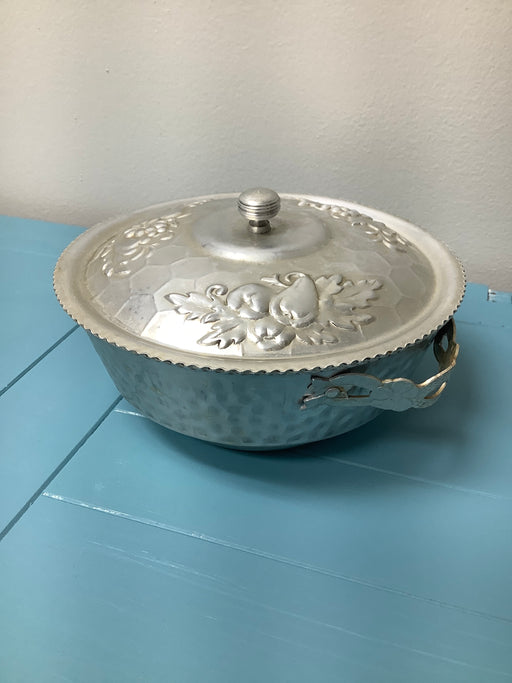 Only 1 left!Hammered aluminum, Nasco Italy, fruit design. 8” round x 5” tall