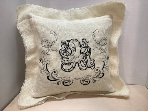 Only 1 left!White burlap embroidered with black octopus and laurel. 20”x20”