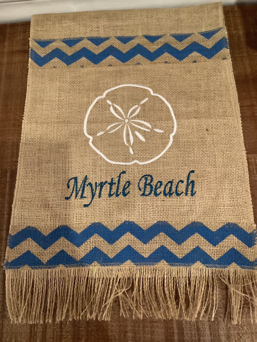 Only 1 left!Small burlap flag embroidered with city name 12"x18”