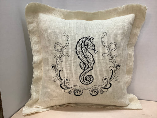 Only 2 left!White burlap embroidered with black seahorse and laurel. 20”x20”