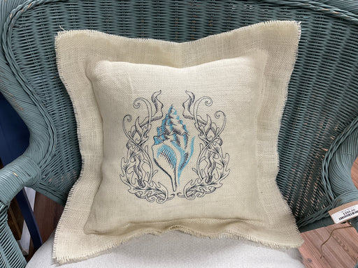 Only 2 left!embroidered burlap pillow with shell motif, 20 x 20”