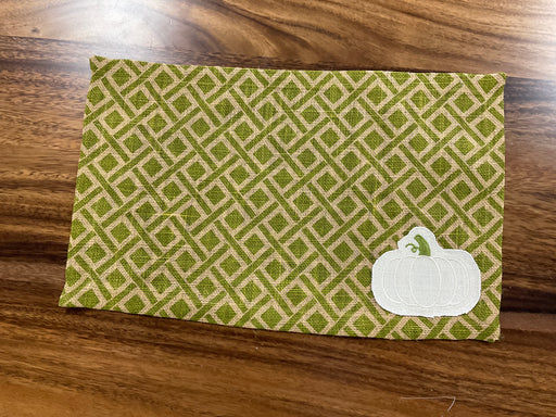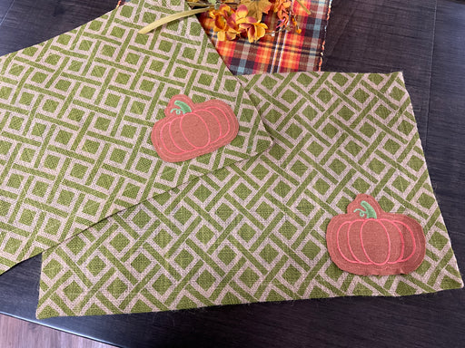 6 in stockBurlap placemats, green geometric with pumpkin, 20” x 12 1/2”