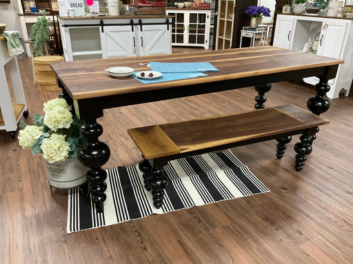 Only 1 left!This stunning dining room table features large modern farmhouse style turned legs finished in a satin tricorn black. Table top is a walnut wood wi...