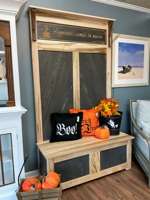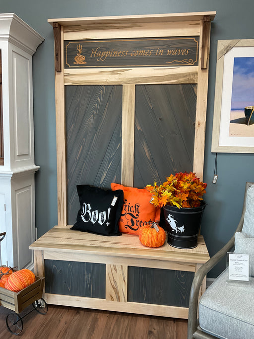 Only 1 left!Two seater hall tree with storage under seats. Made from wormy maple and clear coated. Back panels are gray stained cedar planks. Engraved top s...