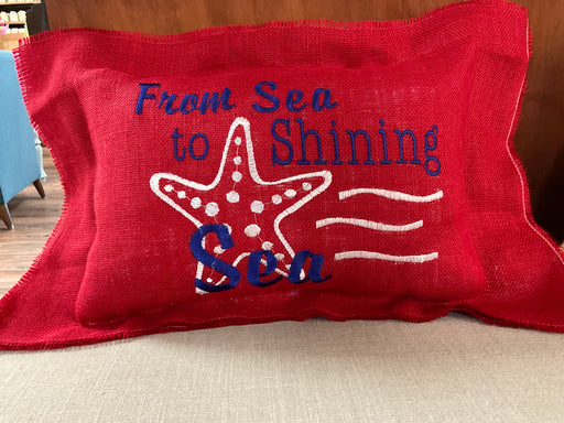 Only 1 left!Burlap pillow embroidered with phrase “From sea to shining sea”.