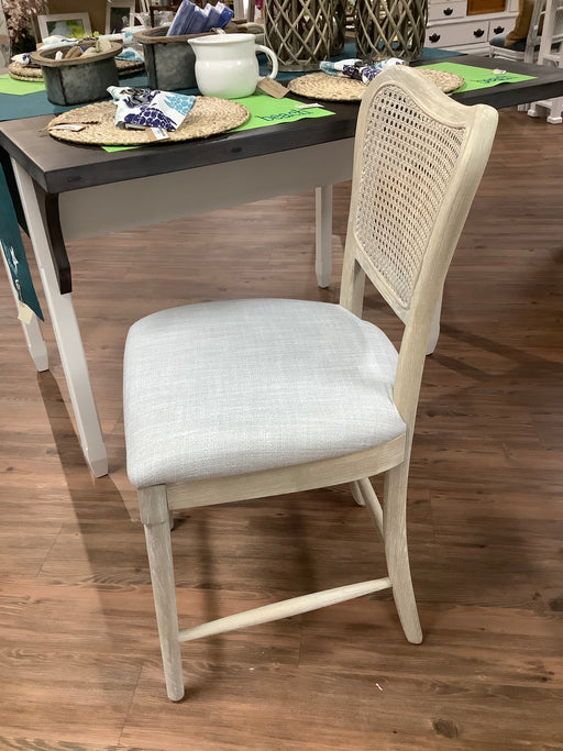 Only 2 left!Cane backed bar stool. Light gray fabric seat and light gray distressed wood. Seat height 24”. 19”x18”x40”