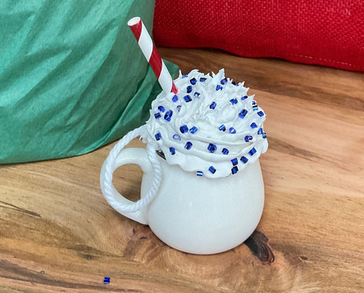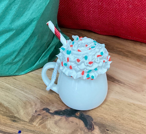 Only 2 left!Small white coffee cup decorated with faux whip cream, straw and a variety of sprinkles. Includes hanging wire. 3” x 4.5”