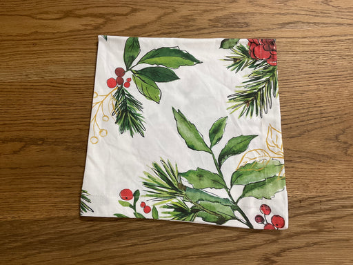 8 in stockFestive print featuring red camillias and greenery napkin. 100% cotton. 19 x 19”