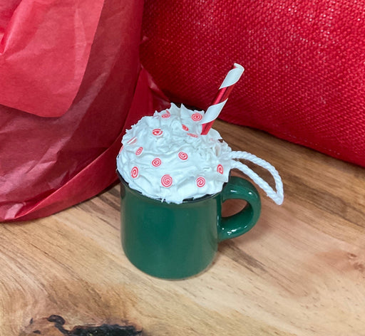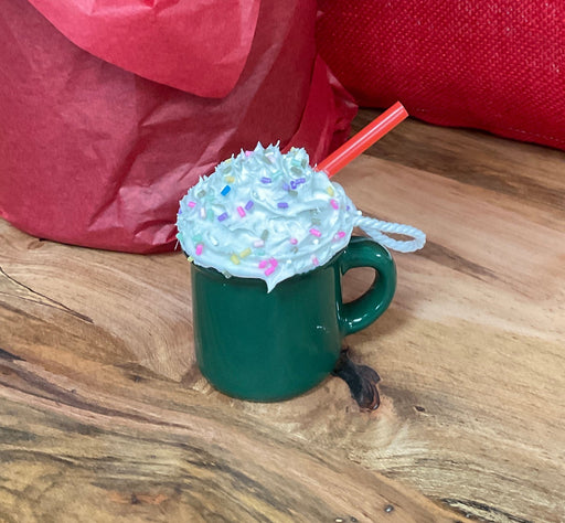 Only 1 left!Small green coffee cup decorated with faux whip cream, straw and a variety of sprinkles. Includes hanging wire. 3” x 4.5”