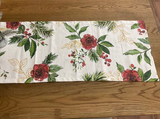 Only 2 left!Festive print table runner featuring red camillia and greenery. 100% cotton. 54 x 19”