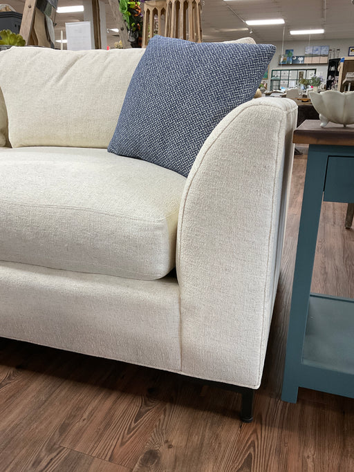 Only 1 left!Artisan Home Collection upholstered sofa. Fabric is parchment, bronze legs and blue accent pillows. 83”x37.5”x32.5”. Fabric options available.