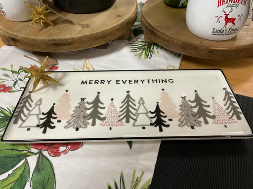 Only 2 left!Ceramic serving tray with various colored Christmas trees with the saying “Merry Everything” 14” x 6”