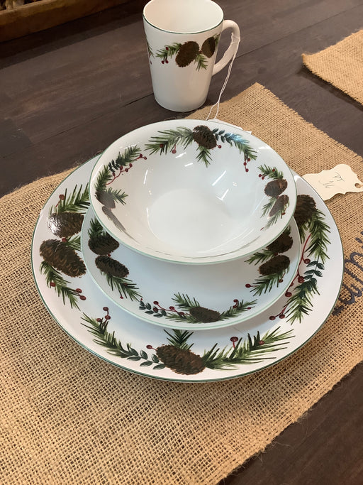 Only 2 left!One set includes dinner plate, salad plate, bowl, and mug