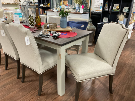 Only 4 left!Artisan Home Collection empire back dining chair. Mica color wood finish, tan upholstered seat with small brass nail head trim. 20” x 21.5” x 38...