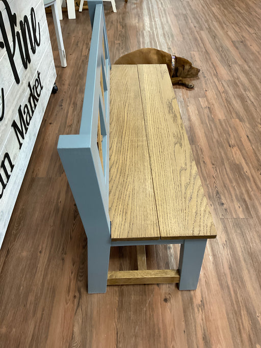 Only 1 left!Poplar wood base painted in a mixed blue color. Oak seat and wood accents stained in Rubio cashmere. 49” x 16.5” x 32”