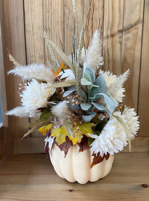 Only 1 left!7” x 24” variety of neutral color silk flowers beautifully arranged in a pumpkin