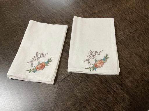 Only 2 left!Fall napkins, embroidered “gather”, 17” x 17 1/2”, white cotton, taupe, orange and teal