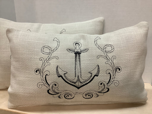 Only 1 left!Beige cream color fabric pillow embroidered with an anchor and rope laurel. 17”x10”