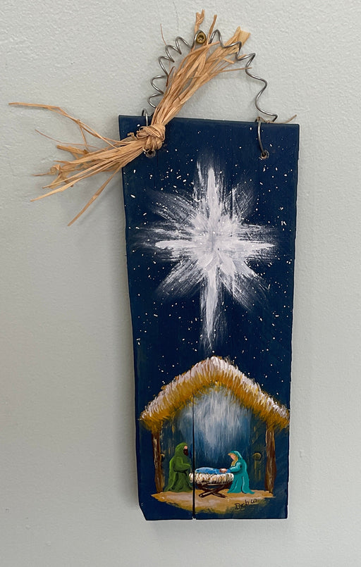 Only 1 left!Hand painted manger scene on wood, 14” x 5 1/2”