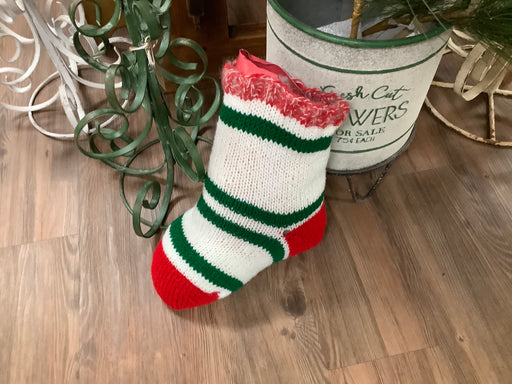 Only 1 left!Hand knit Christmas stocking for decoration. 20” x 8” white, red with green stripes.