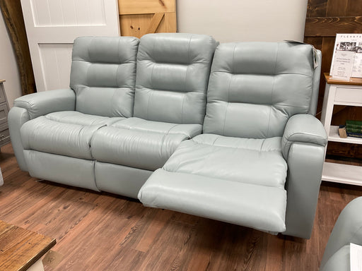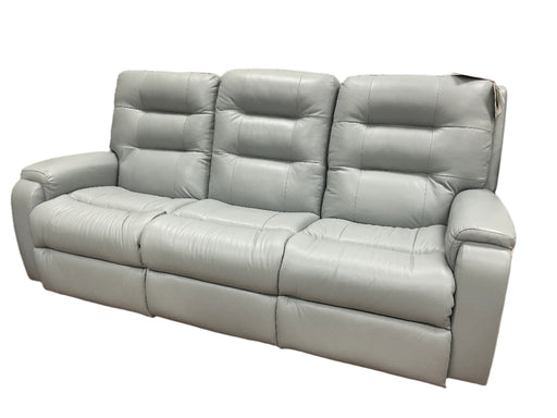 Only 1 left!Artisan Home Collection - Arlo power reclining sofa with power headrests and lumbar in mist leather. 87"x42"x43". Fabric options available.