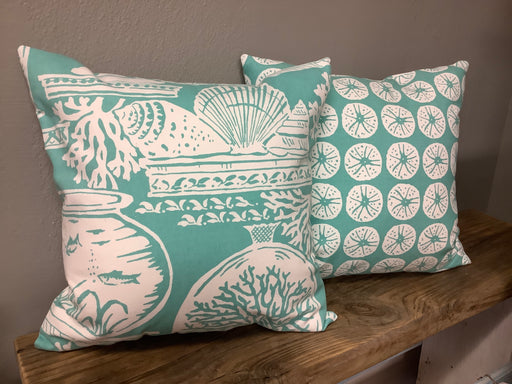 Only 1 left!Aqua goldfish bowls and sand dollar print fabric pillow. 16”x16”