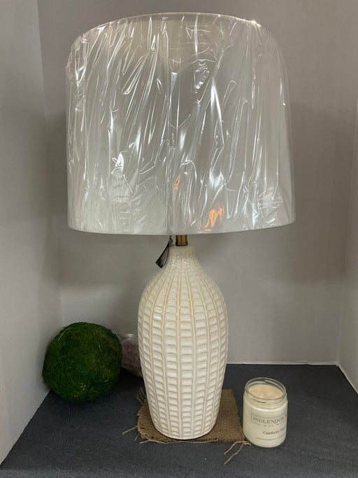 Only 2 left!Ceramic lamp tan and white weave look with white lamp shade. 5” x 6” x 25”