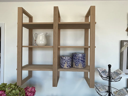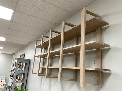 Only 1 left!White Oak shelf unit with removable shelves finished with a Dixie Belle white wax. Includes 5 wood rings, 6 shelves and mounting brackets. Overall...