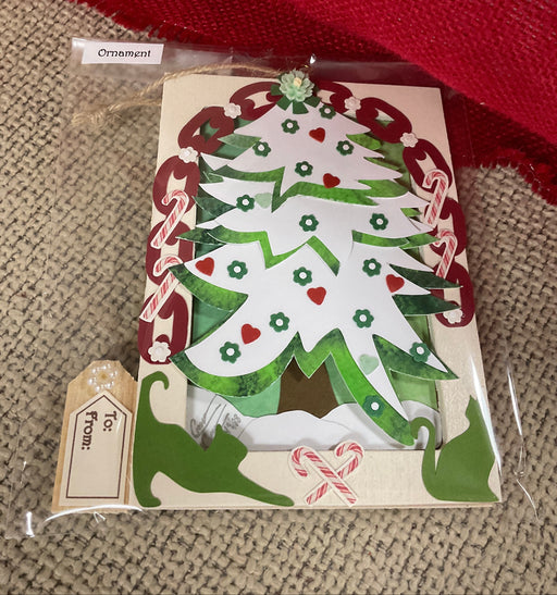 Only 1 left!Handmade from hand cut paper, each Christmas tree is decorated and secured in a wooden framed ornament for hanging. Each one comes in a pre-packa...