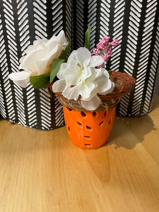 Only 1 left!Hand woven pine needle trim on ceramic vase or candle holder. 5” round x4”