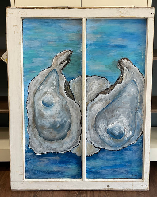 Only 1 left!Oyster shell hand painted in a vintage window. Acrylic blue and grays.