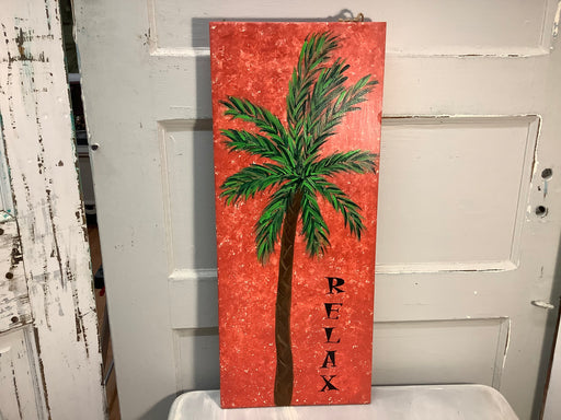 Only 1 left!Hand painted wood sign with “ relax” and palm tree. Includes wall hanger. 9.5” x 24”