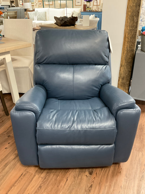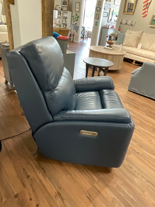 Only 1 left!Artisan Home Collection presents the Rio power rocking recliner with power headrest. In a navy leather material. 38"x41"x42"