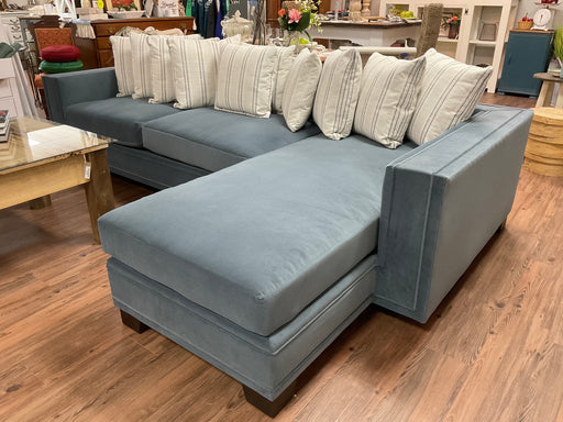 Only 1 left!Artisan Home Collection border track Right arm chaise sofa sectional with multi pillow back. Fabric is slate and tobacco finish wood legs. Chaise...
