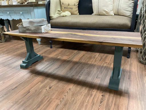 Only 1 left!Our Romulus coffee table design features a trestle leg base with a natural walnut top. Stormy seas blue painted legs. 60.5" x 18” x 19”.