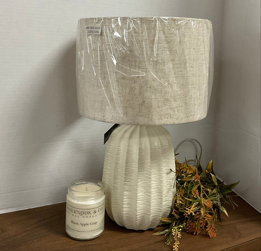 Only 2 left!White/cream ceramic ribbed base with beige shade. 16" tall x 10" round shade