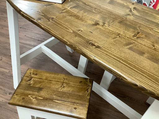 Only 1 left!Hand made from dimensional lumber. Base is painted white and the top is stained in a walnut color. Includes two bar stools and bench stool.. 71...