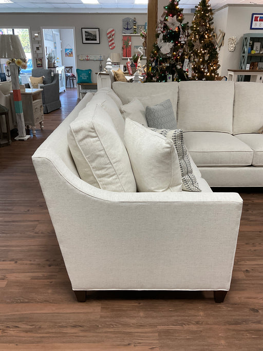 Only 1 left!Artisan Home collection left and right sofa sectional finished in Snow color fabric and tobacco tapered legs. Welted slope arms and box border bac...
